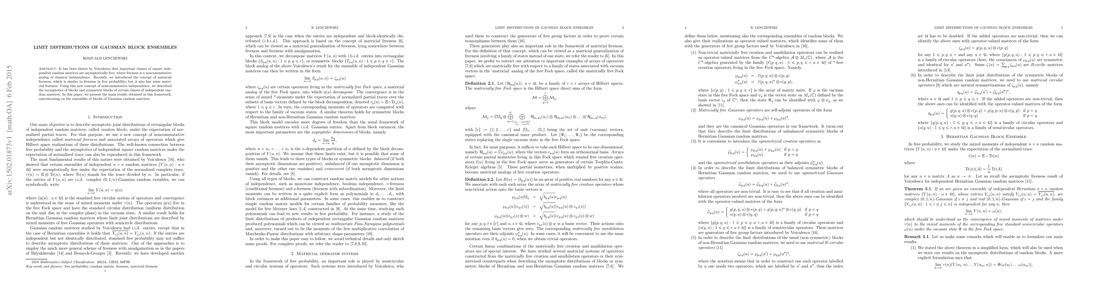 This paper investigates the limit distributions of Gaussian block ensembles, focusing on their asymptotic behavior using a concept of noncommutative independence.