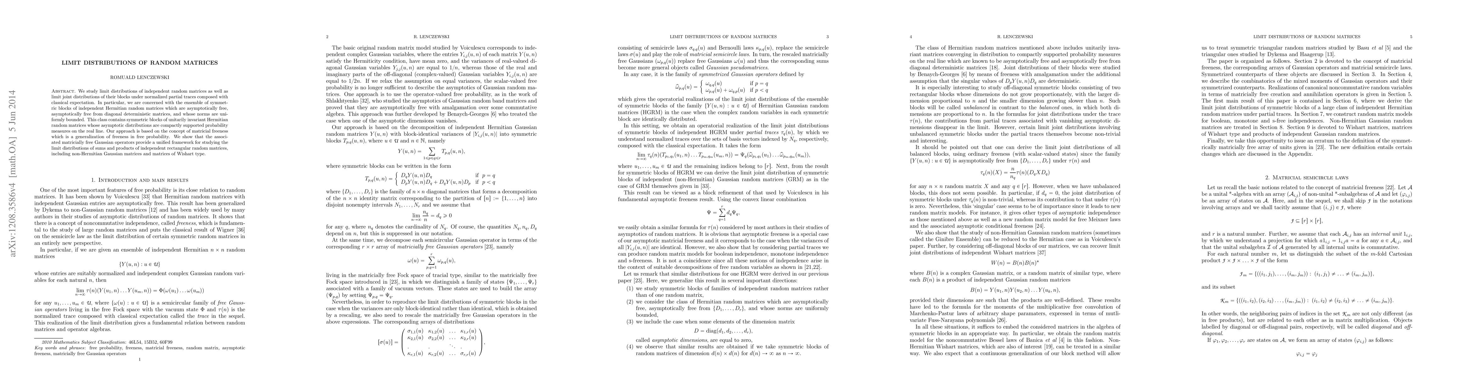 Summary: This paper investigates limit distributions of independent random matrices, particularly focusing on asymptotically free symmetric blocks of Hermitian matrices. It employs matricial freeness to unify the study of various matrix distributions, including Gaussian and Wishart types, and develops models for different types of independence.