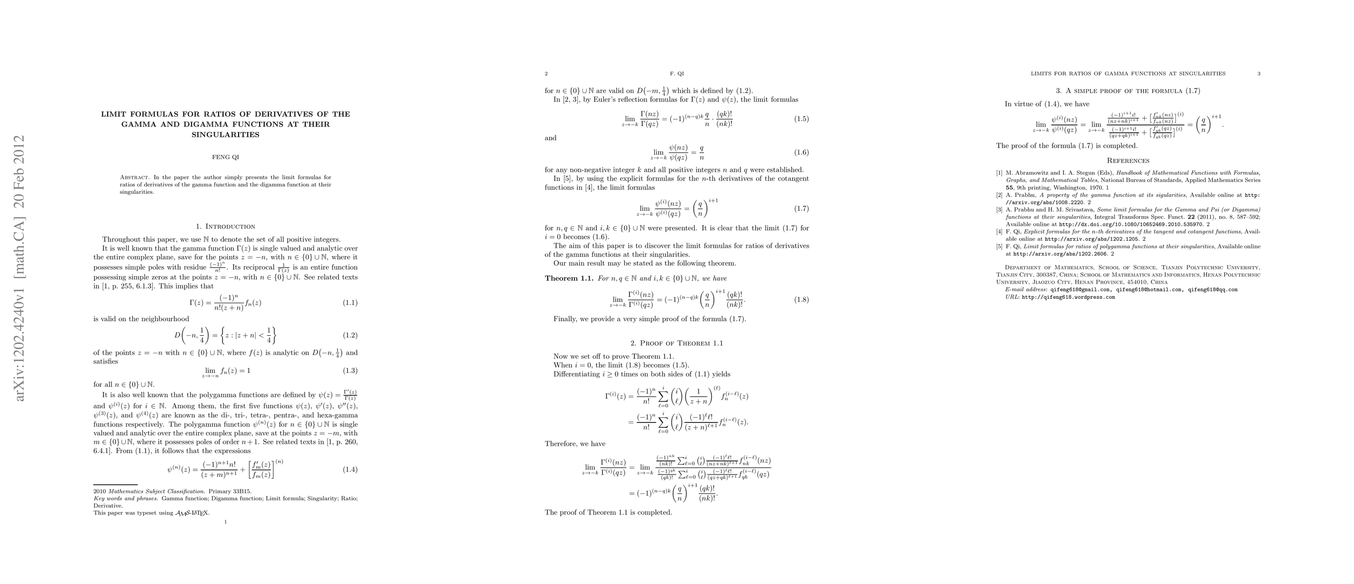In the paper the author simply presents the limit formulas for ratios of derivatives of the gamma function and the digamma function at their singularities.