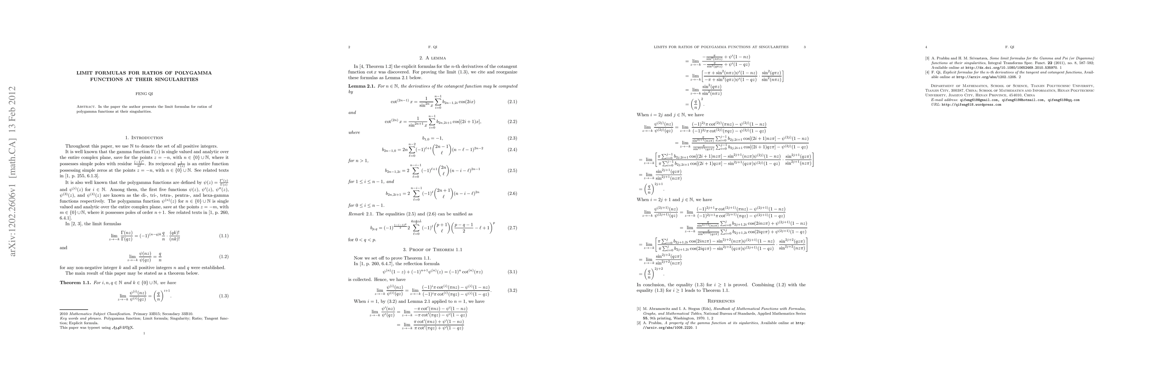 In the paper the author presents limit formulas for ratios of polygamma functions at their singularities.