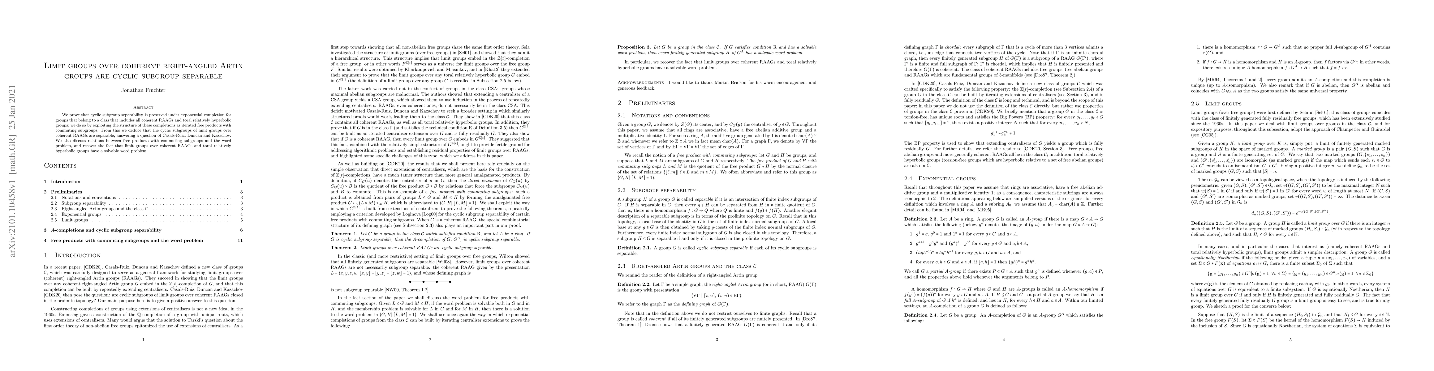 We prove that cyclic subgroup separability is preserved under exponential completion for groups that belong to a class that includes all coherent RAAGs and toral relatively hyperbolic groups; we do so by exploiting the structure of these completions as iterated free products with commuting subgroups. From this we deduce that the cyclic subgroups of limit groups over coherent RAAGs are separable, answering a question of Casals-Ruiz, Duncan and Kazachov. We also discuss relations between free products with commuting subgroups and the word problem, and recover the fact that limit groups over coherent RAAGs and toral relatively hyperbolic groups have a solvable word problem.