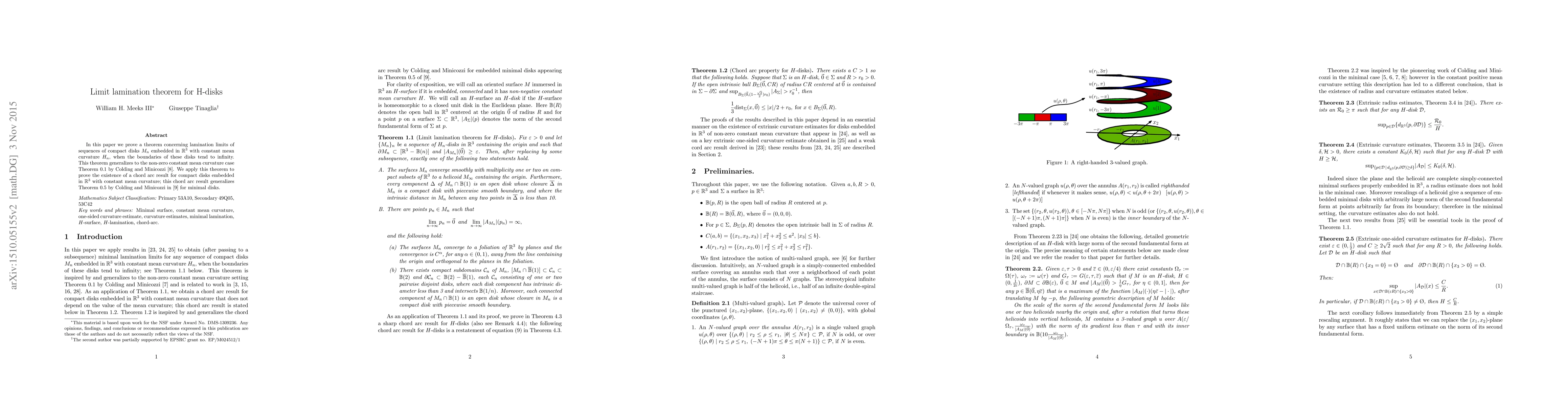 This paper proves a limit lamination theorem for sequences of compact disks in $\mathbb{R}^3$ with constant mean curvature, generalizing previous results for minimal surfaces. It also establishes a chord arc property for these disks, extending earlier findings for minimal disks.