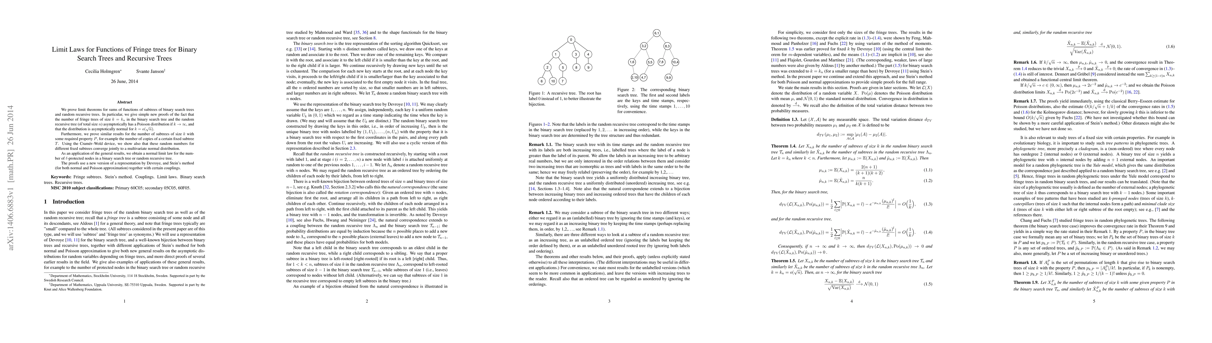 This paper proves limit theorems for functions of subtrees in binary search trees and recursive trees, showing that the number of fringe trees of size $k$ follows a Poisson distribution as $k \rightarrow \infty$, and a normal distribution when $k=o(\sqrt{n})$. It also extends these results to subtrees with specific properties, and applies the findings to $\ell$-protected nodes.