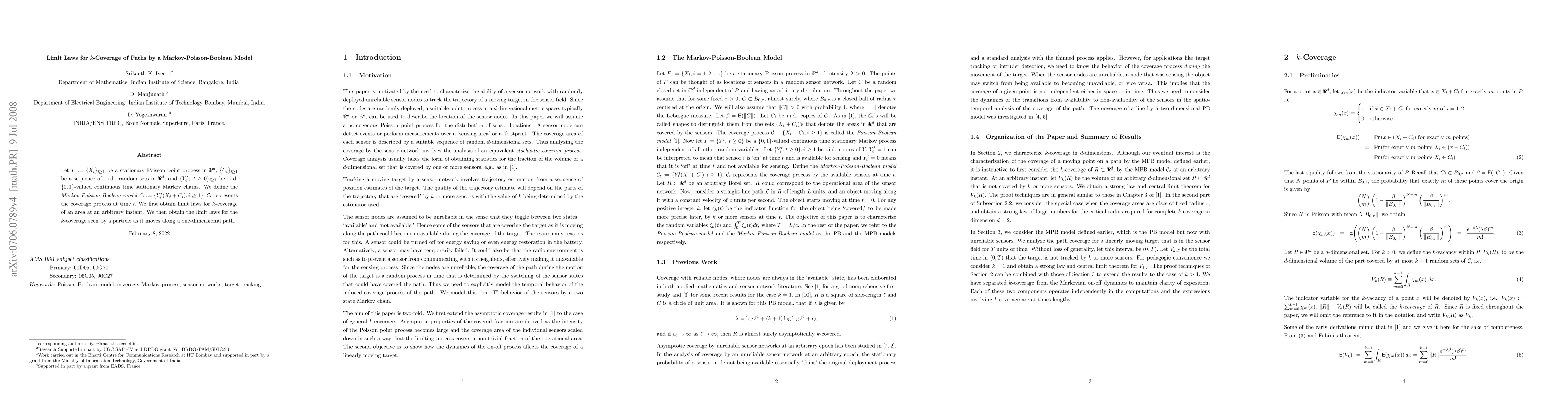 This paper investigates limit laws for k-coverage of paths under a Markov-Poisson-Boolean model, where coverage is determined by a Poisson point process, random sets, and Markov chains. It derives limit laws for both static k-coverage of an area and dynamic k-coverage along a path.