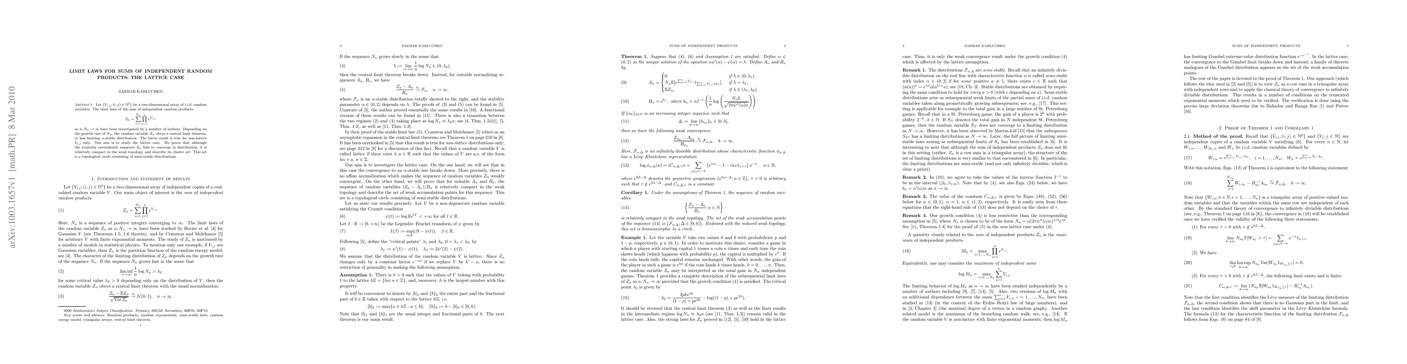 Let $\{V_{i,j}; (i,j)\in\N^2\}$ be a two-dimensional array of i.i.d.\ random variables. The limit laws of the sum of independent random products $$ Z_n=\sum_{i=1}^{N_n} \prod_{j=1}^{n} e^{V_{i,j}} $$ as $n,N_n\to\infty$ have been investigated by a number of authors. Depending on the growth rate of $N_n$, the random variable $Z_n$ obeys a central limit theorem, or has limiting $\alpha$-stable distribution. The latter result is true for non-lattice $V_{i,j}$ only. Our aim is to study the lattice case. We prove that although the (suitably normalized) sequence $Z_n$ fails to converge in distribution, it is relatively compact in the weak topology, and describe its cluster set. This set is a topological circle consisting of semi-stable distributions.