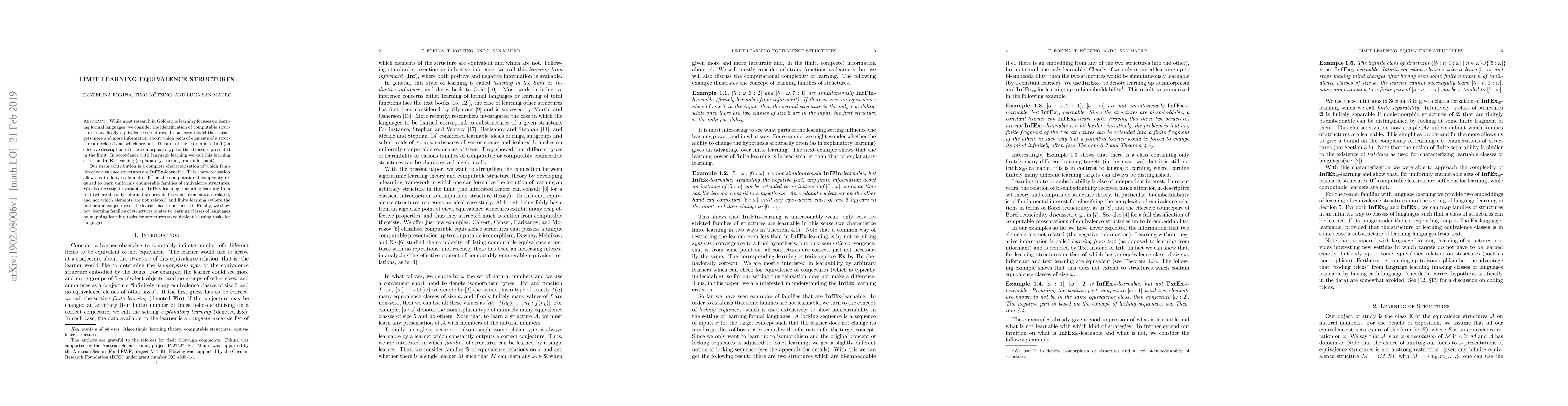 This paper explores the identification and learning of computable equivalence structures through InfEx-learning, providing a complete characterization of InfEx-learnable families. It also establishes a computational complexity bound and examines variants like text-based and finite learning, linking structure learning to language learning.