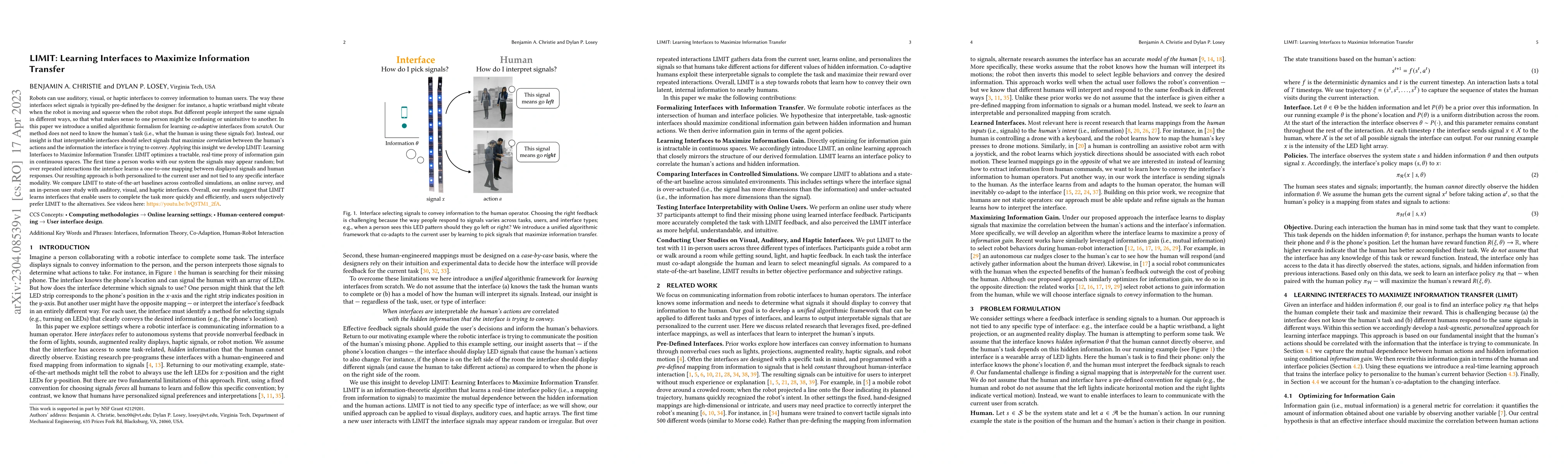 The paper introduces LIMIT, a method for learning co-adaptive interfaces that optimize information transfer by maximizing the correlation between human actions and conveyed signals. LIMIT personalizes interfaces without prior knowledge of the user's task, demonstrating improved task efficiency and user preference over state-of-the-art baselines in simulations, surveys, and user studies.