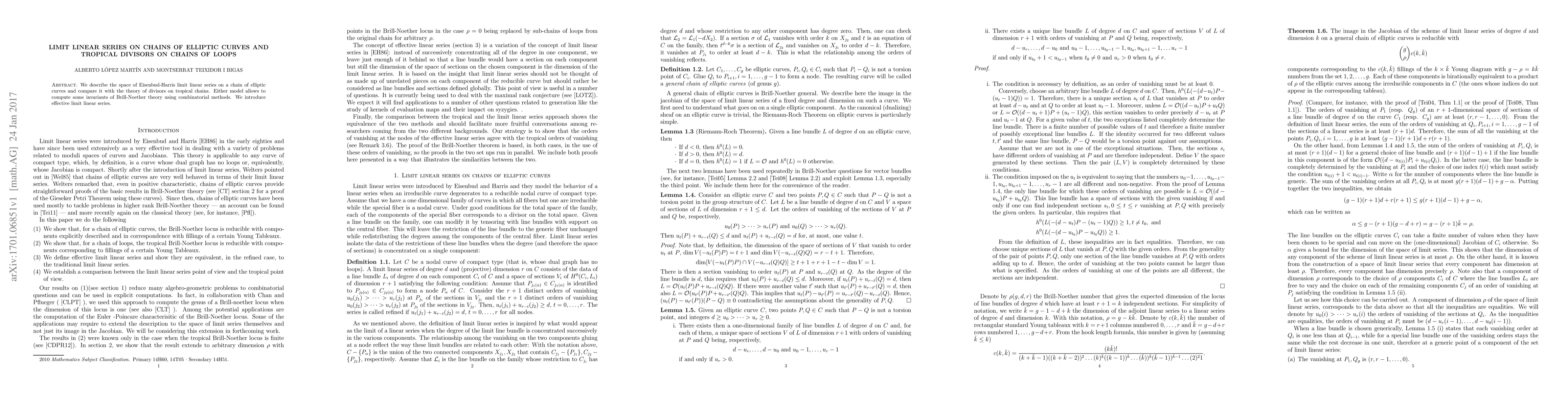 The paper explores the space of Eisenbud-Harris limit linear series on elliptic curve chains and correlates it with tropical divisor theory, demonstrating that both frameworks enable combinatorial computation of Brill-Noether invariants. It also introduces the concept of effective limit linear series.