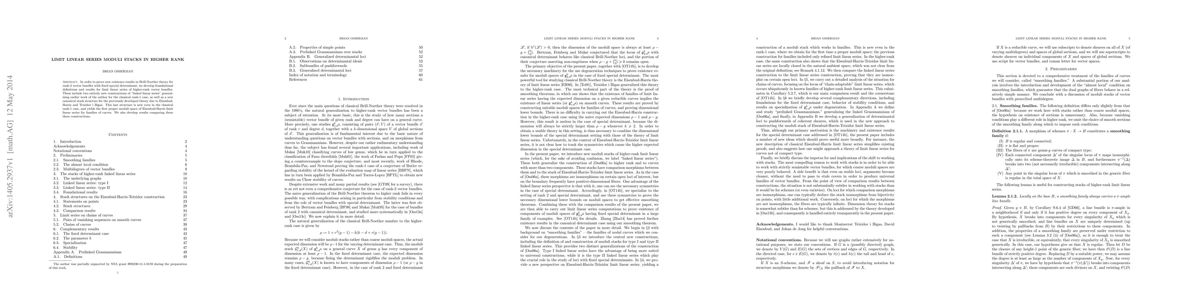 In order to prove new existence results in Brill-Noether theory for rank-2 vector bundles with fixed special determinant, we develop foundational definitions and results for limit linear series of higher-rank vector bundles. These include two entirely new constructions of "linked linear series" generalizing earlier work of the author for the classical rank-1 case, as well as a new canonical stack structure for the previously developed theory due to Eisenbud, Harris and Teixidor i Bigas. This last structure is new even in the classical rank-1 case, and yields the first proper moduli space of Eisenbud-Harris limit linear series for families of curves. We also develop results comparing these three constructions.