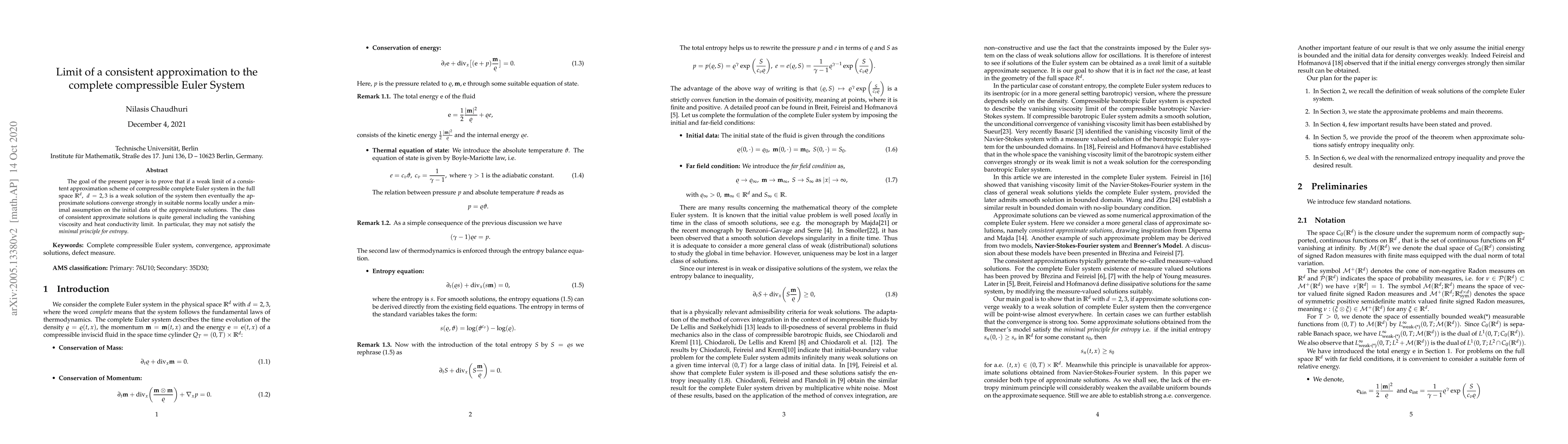 The goal of the present paper is to prove that if a weak limit of a consistent approximation scheme of compressible complete Euler system in the full space $ \mathbb{R}^d,\; d=2,3 $ is a weak solution of the system then eventually the approximate solutions converge strongly in suitable norms locally under a minimal assumption on the initial data of the approximate solutions. The class of consistent approximate solutions is quite general including the vanishing viscosity and heat conductivity limit. In particular, they may not satisfy the minimal principle for entropy.