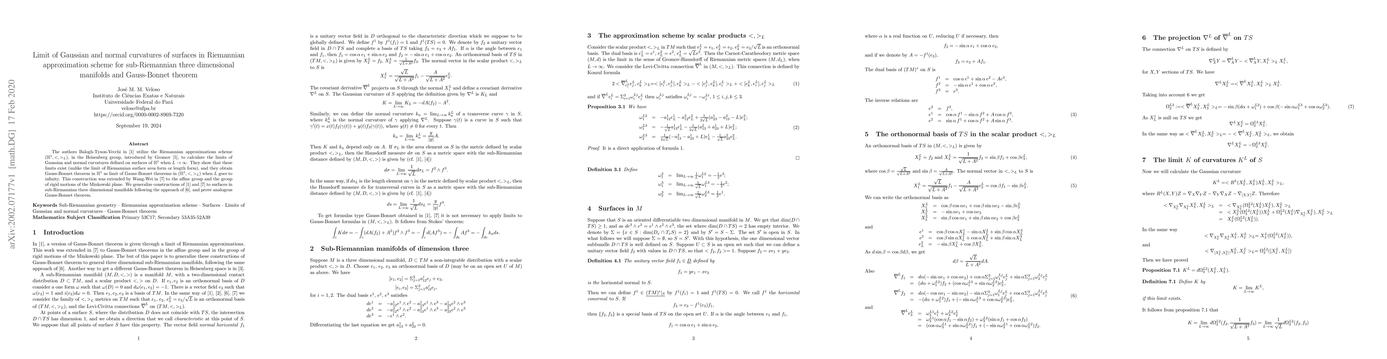 The paper investigates the limits of Gaussian and normal curvatures on surfaces in sub-Riemannian three-dimensional manifolds using Riemannian approximations, proving their existence and extending the Gauss-Bonnet theorem to this context. The authors generalize previous results from the Heisenberg group and Minkowski plane to broader sub-Riemannian settings.