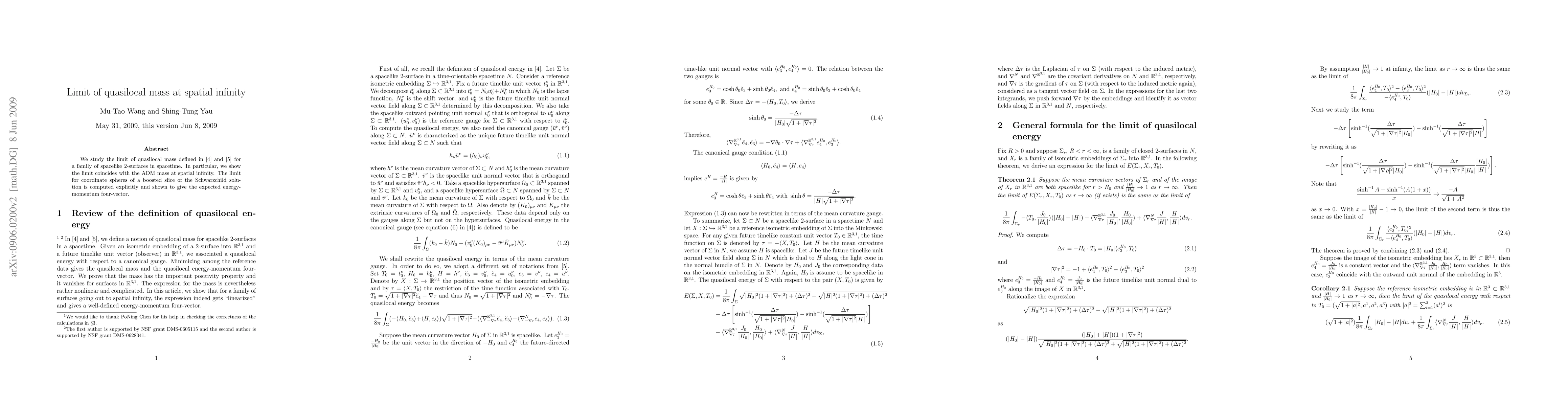 We study the limit of quasilocal mass defined in [4] and [5] for a family of spacelike 2-surfaces in spacetime. In particular, we show the limit coincides with the ADM mass at spatial infinity. The limit for coordinate spheres of a boosted slice of the Schwarzchild solution is computed explicitly and shown to give the expected energy-momentum four vector.