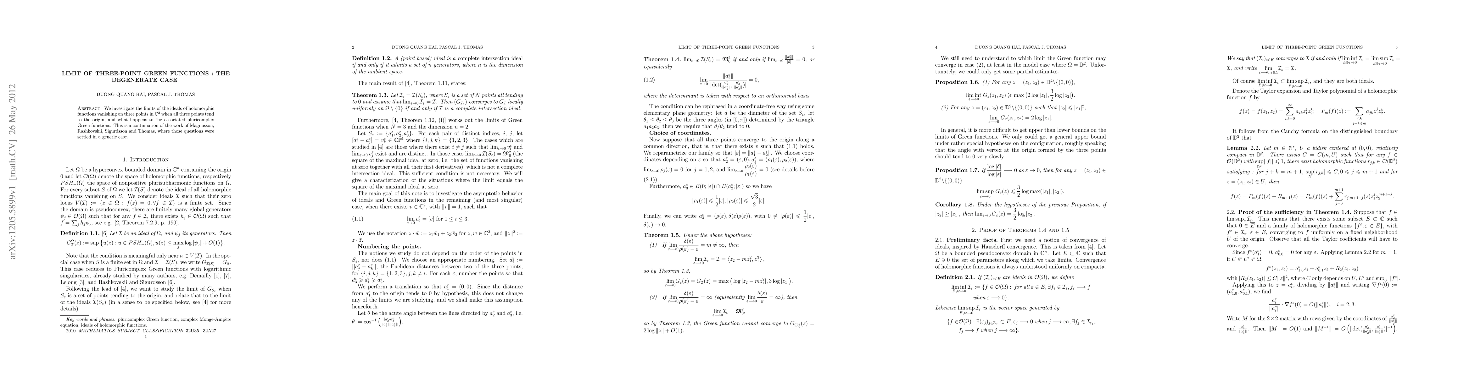 We investigate the limits of the ideals of holomorphic functions vanishing on three points in $\C^2$ when all three points tend to the origin, and what happens to the associated pluricomplex Green functions. This is a continuation of the work of Magnusson, Rashkovskii, Sigurdsson and Thomas, where those questions were settled in a generic case.