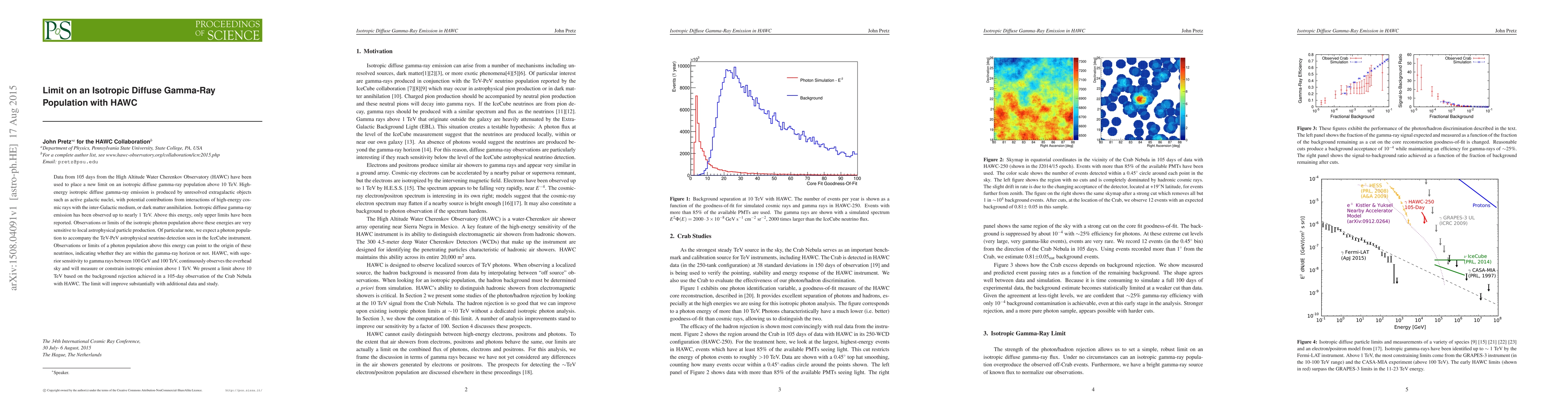 The HAWC observatory has set a new upper limit on an isotropic diffuse gamma-ray population above 10 TeV using 105 days of data. This limit helps constrain the origins of high-energy astrophysical neutrinos and the potential interactions of high-energy cosmic rays with the intergalactic medium.