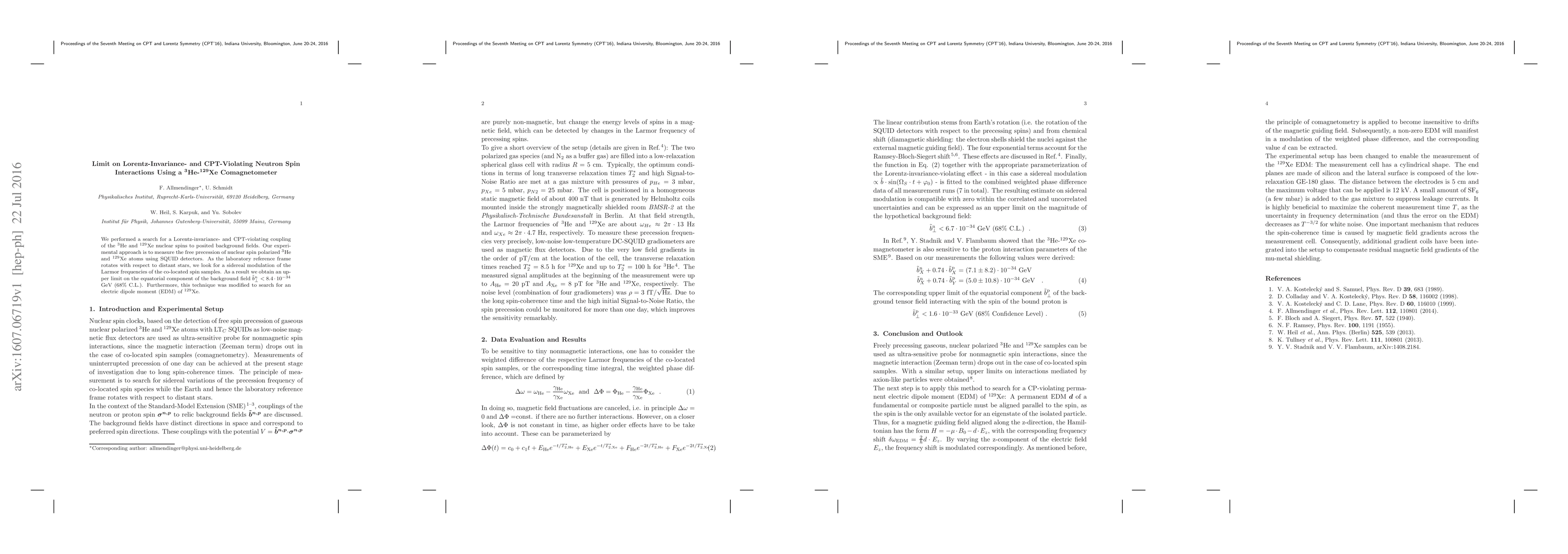 Researchers used a $^3$He-$^{129}$Xe comagnetometer to search for Lorentz-invariance- and CPT-violating interactions, setting an upper limit of $ ilde{b}^n_{ot}< 8.4 imes 10^{-34}$ GeV on the equatorial component of background fields.