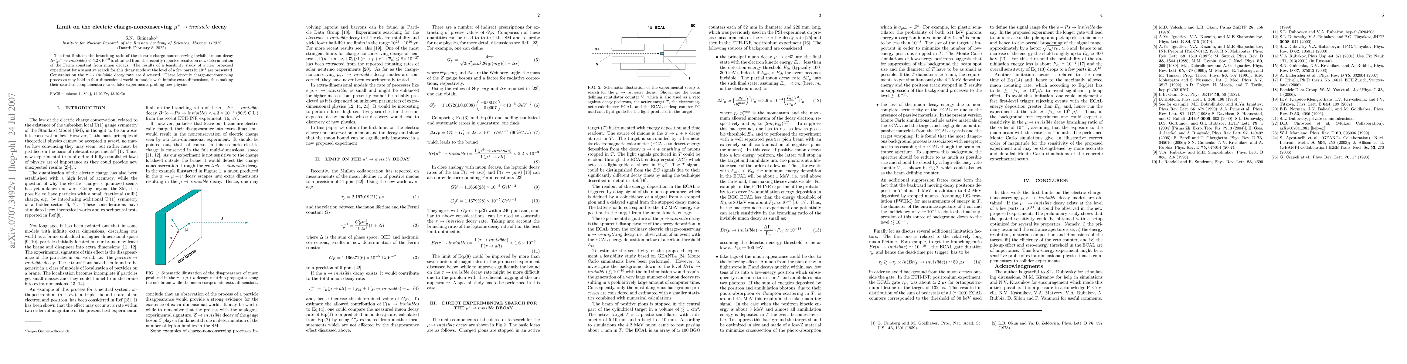The first limit on the branching ratio of the electric charge-nonconserving invisible muon decay $Br(\mu^+ \to invisible) < 5.2 \times 10^{-3}$ is obtained from the recently reported results on new determination of the Fermi constant from muon decays. The results of a feasibility study of a new proposed experiment for a sensitive search for this decay mode at the level of a few parts in 10^{11} are presented. Constrains on the $\tau \to invisible$ decay rate are discussed. These leptonic charge-nonconserving processes may hold in four-dimensional world in models with infinite extra dimensions, thus making their searches complementary to collider experiments probing new physics.