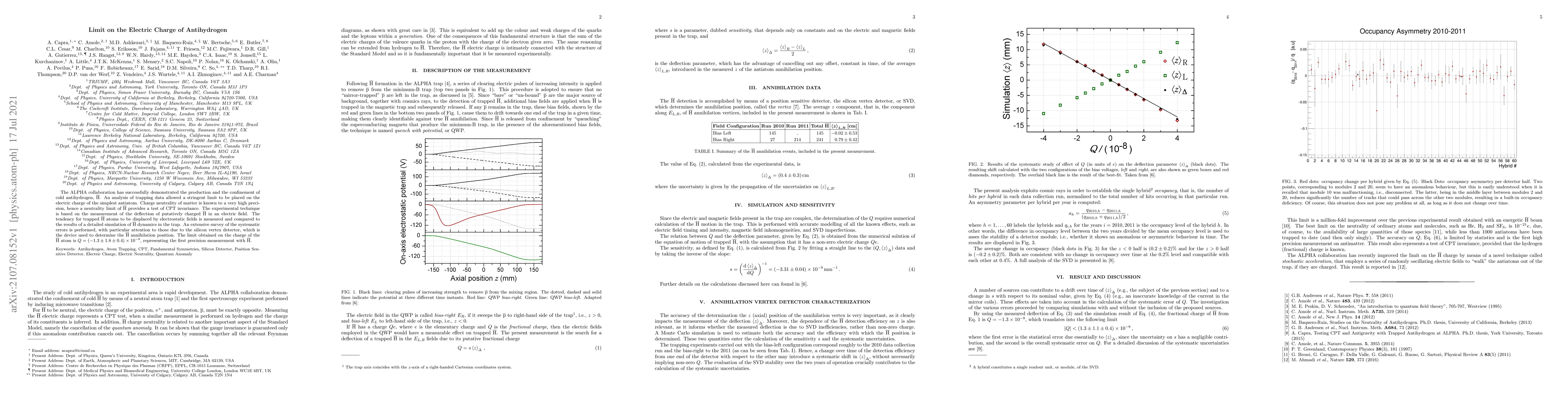 The ALPHA collaboration has successfully demonstrated the production and the confinement of cold antihydrogen, $\overline{\mathrm{H}}$. An analysis of trapping data allowed a stringent limit to be placed on the electric charge of the simplest antiatom. Charge neutrality of matter is known to a very high precision, hence a neutrality limit of $\overline{\mathrm{H}}$ provides a test of CPT invariance. The experimental technique is based on the measurement of the deflection of putatively charged $\overline{\mathrm{H}}$ in an electric field. The tendency for trapped $\overline{\mathrm{H}}$ atoms to be displaced by electrostatic fields is measured and compared to the results of a detailed simulation of $\overline{\mathrm{H}}$ dynamics in the trap. An extensive survey of the systematic errors is performed, with particular attention to those due to the silicon vertex detector, which is the device used to determine the $\overline{\mathrm{H}}$ annihilation position. The limit obtained on the charge of the $\overline{\mathrm{H}}$ atom is \mbox{$ Q = (-1.3\pm1.8\pm0.4)\times10^{-8}$}, representing the first precision measurement with $\overline{\mathrm{H}}$.