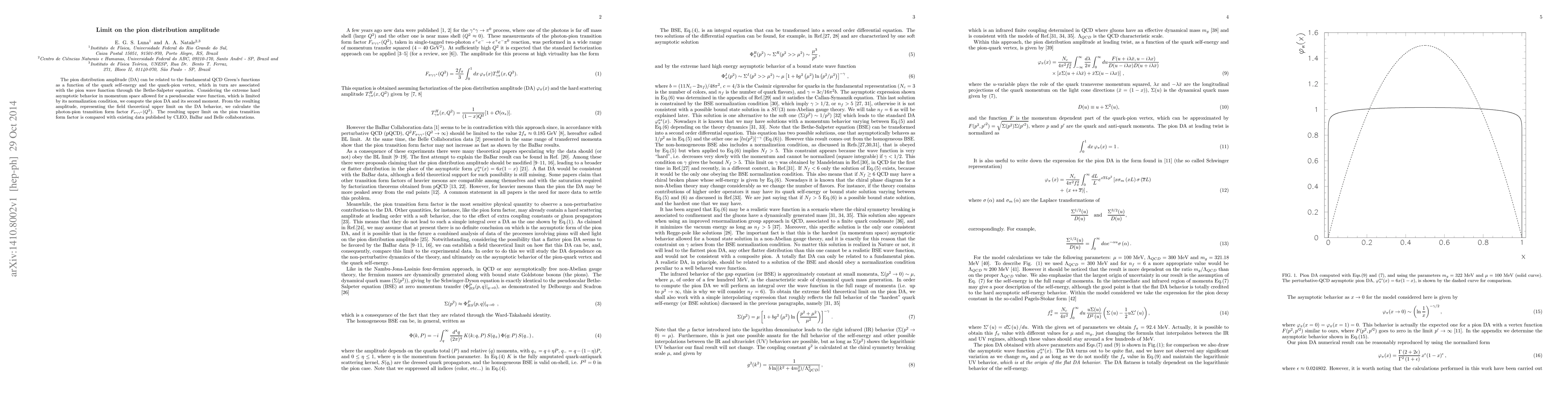 This paper computes the pion distribution amplitude (DA) and its second moment, establishing a field theoretical upper limit on its behavior. It then calculates the photon-pion transition form factor, comparing the resulting upper limit with data from CLEO, BaBar, and Belle collaborations.