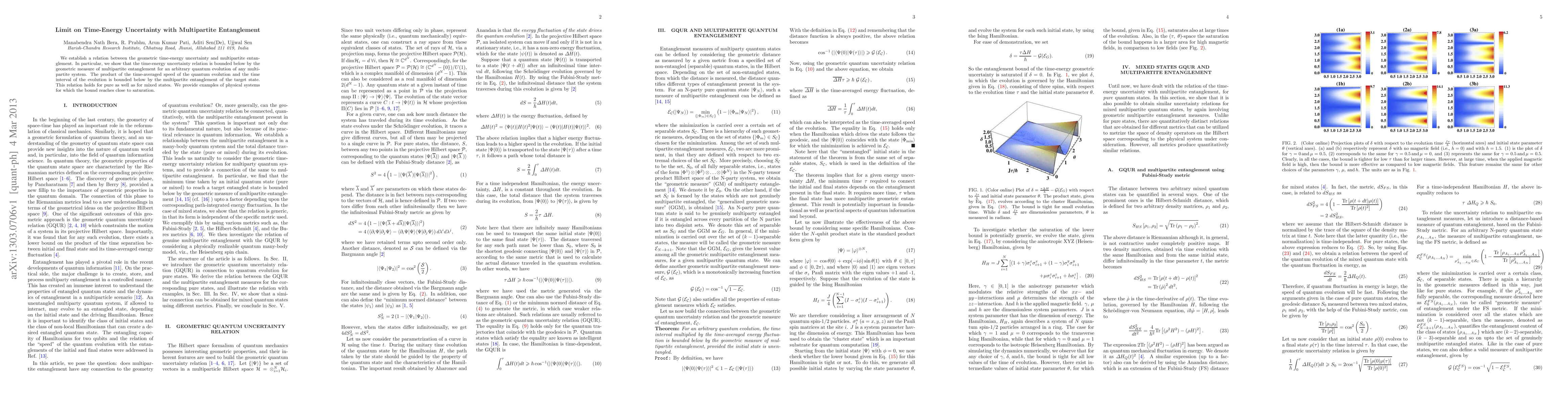 This paper establishes a limit on time-energy uncertainty for multipartite entanglement, showing that the geometric measure of entanglement bounds the product of time-averaged speed and evolution time.