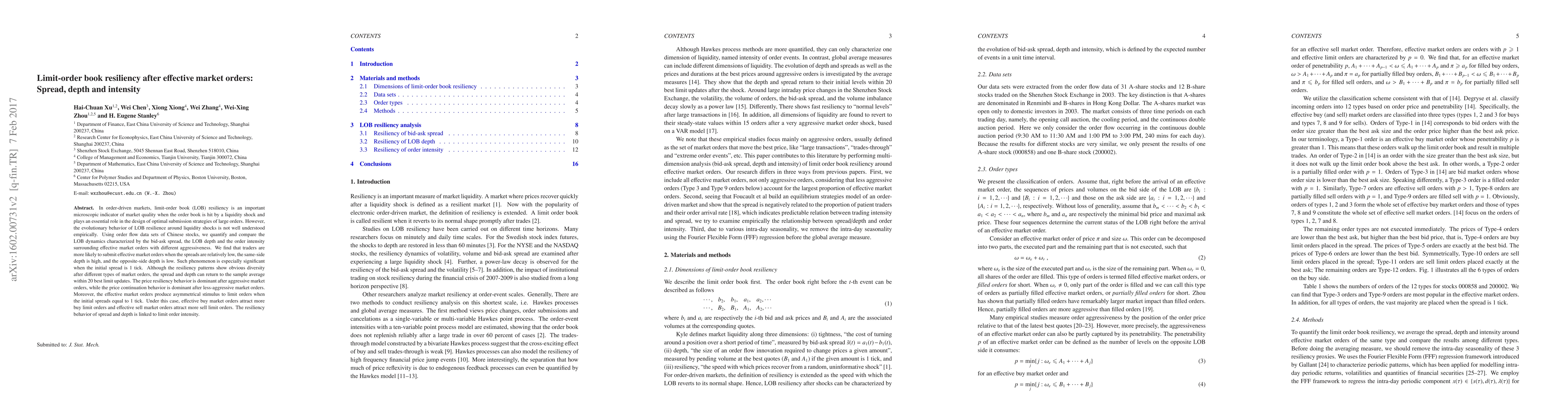 This paper explores the resiliency of the limit-order book (LOB) after liquidity shocks from effective market orders, focusing on spread, depth, and order intensity in Chinese stocks. It finds that traders prefer aggressive market orders when spreads are low and same-side depth is high, with LOB metrics returning to average within 20 updates, showing asymmetric effects on limit orders.