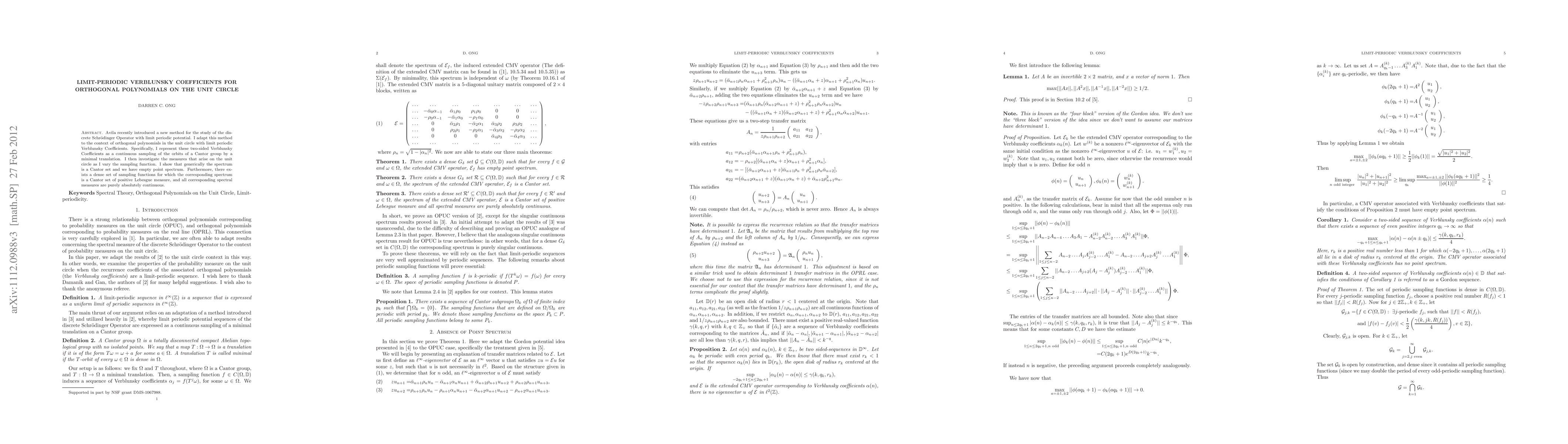 This paper adapts Avila's method for studying discrete Schrödinger operators to orthogonal polynomials on the unit circle, representing limit-periodic Verblunsky coefficients as a continuous sampling of a Cantor group's orbits. The study investigates the resulting measures on the unit circle as the sampling function varies.