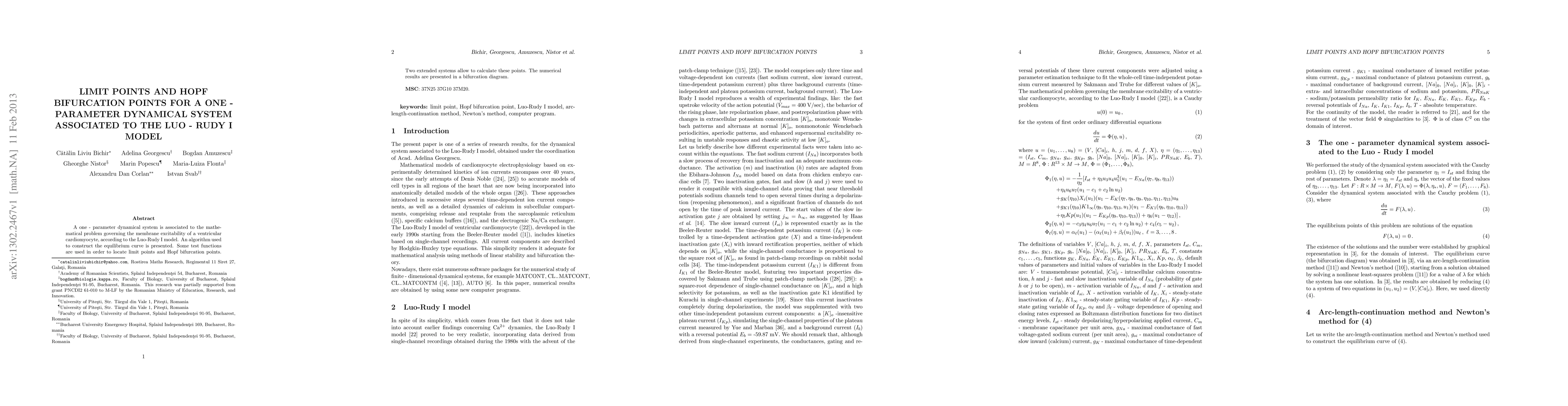 A one - parameter dynamical system is associated to the mathematical problem governing the membrane excitability of a ventricular cardiomyocyte, according to the Luo-Rudy I model. An algorithm used to construct the equilibrium curve is presented. Some test functions are used in order to locate limit points and Hopf bifurcation points. Two extended systems allow to calculate these points. The numerical results are presented in a bifurcation diagram.