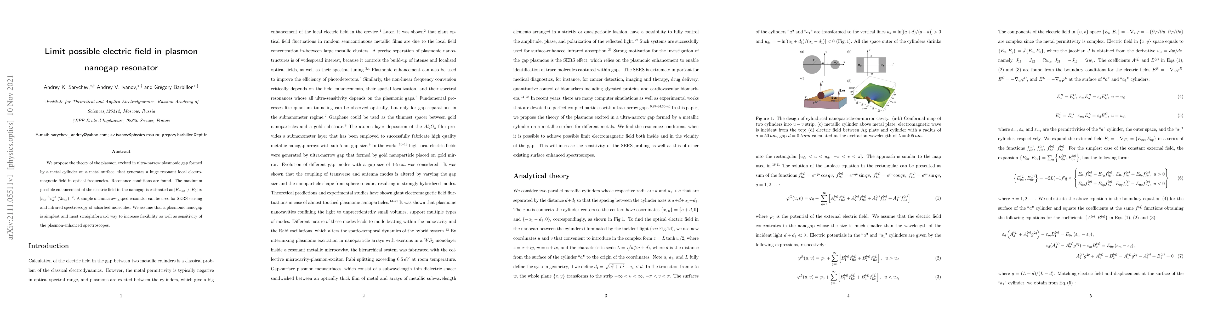 We propose the theory of the plasmon excited in ultra-narrow plasmonic gap formed by a metal cylinder on a metal surface, that generates a huge resonant local electromagnetic field in optical frequencies. Resonance conditions are found. The maximum possible enhancement of the electric field in the nanogap is estimated as $\left|E_{max} \right|/ \left| E_{0} \right| \propto \left| \varepsilon_m \right|^{3} \varepsilon_{d}^{-1} \left( \Im \varepsilon_{m}\right) ^{-2}$ A simple ultranarrow-gaped resonator can be used for SERS sensing and infrared spectroscopy of adsorbed molecules. We assume that a plasmonic nanogap is simplest and most straightforward way to increase flexibility as well as sensitivity of the plasmon-enhanced spectroscopes.