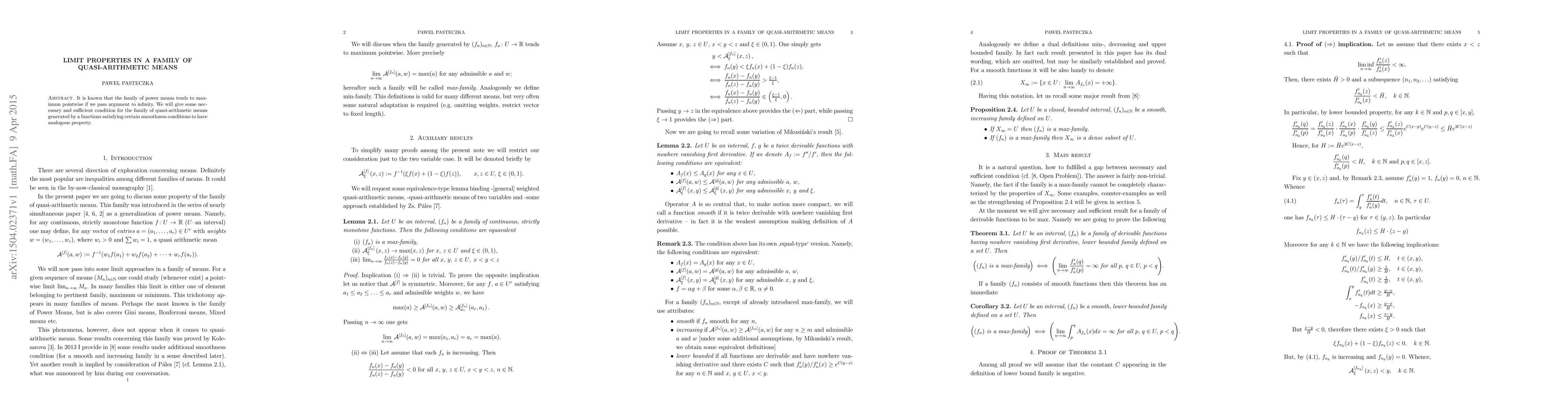 This paper establishes necessary and sufficient conditions for a family of quasi-arithmetic means, defined by functions with specific smoothness properties, to converge to a maximum pointwise as the argument approaches infinity. It extends the limit behavior observed in the family of power means.
