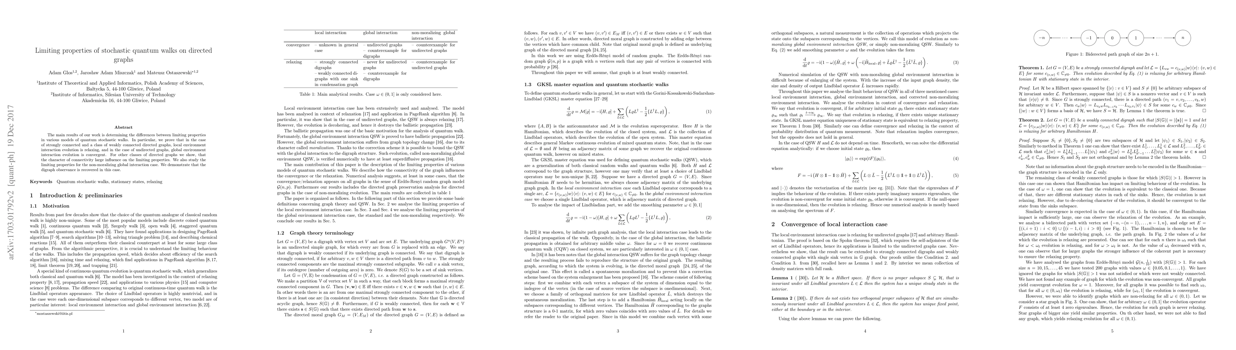 The main results of our work is determining the differences between limiting properties in various models of quantum stochastic walks. In particular, we prove that in the case of strongly connected and a class of weakly connected directed graphs, local environment interaction evolution is relaxing, and in the case of undirected graphs, global environment interaction evolution is convergent. For other classes of directed graphs we show, that the character of connectivity large influence on the limiting properties. We also study the limiting properties for the non-moralizing global interaction case. We demonstrate that the digraph observance is recovered in this case.