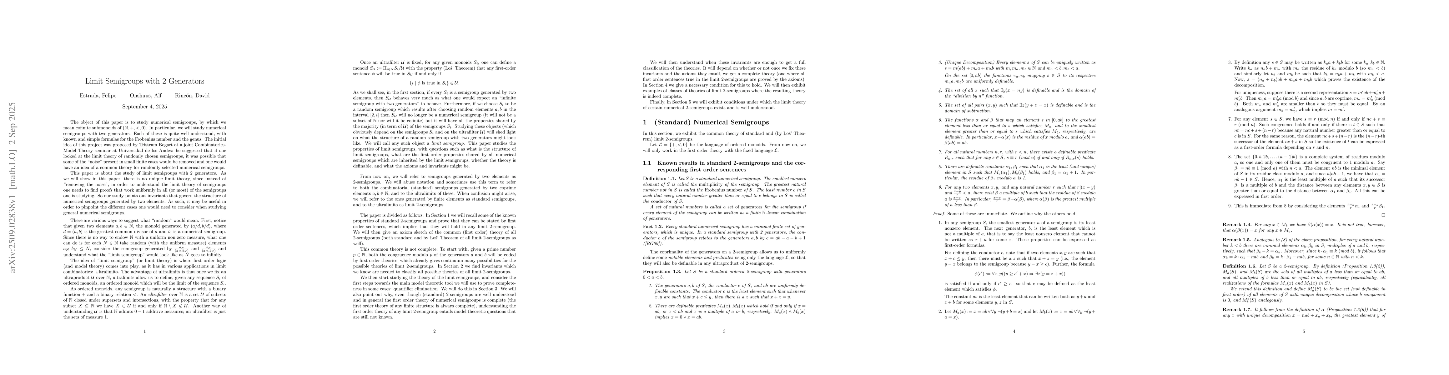 In this paper we study the limit theory of numerical semigroups with two generators. We give a complete axiomatization in some cases.