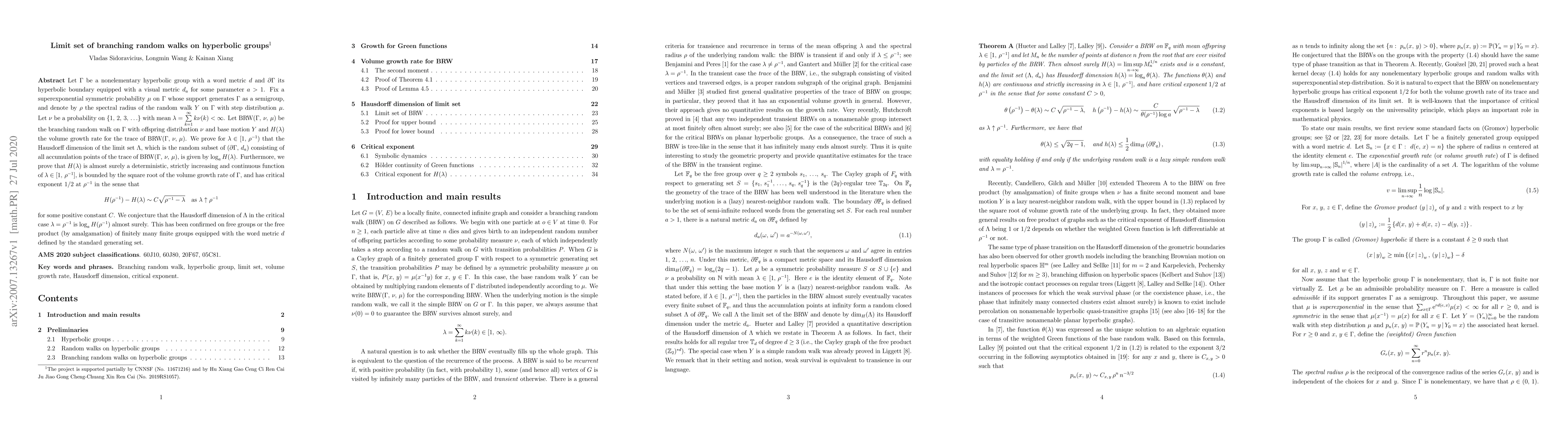 The research paper studies the limit set of branching random walks on hyperbolic groups and finds that its Hausdorff dimension is related to the volume growth rate of the group, with a surprising connection between the two in the critical case.