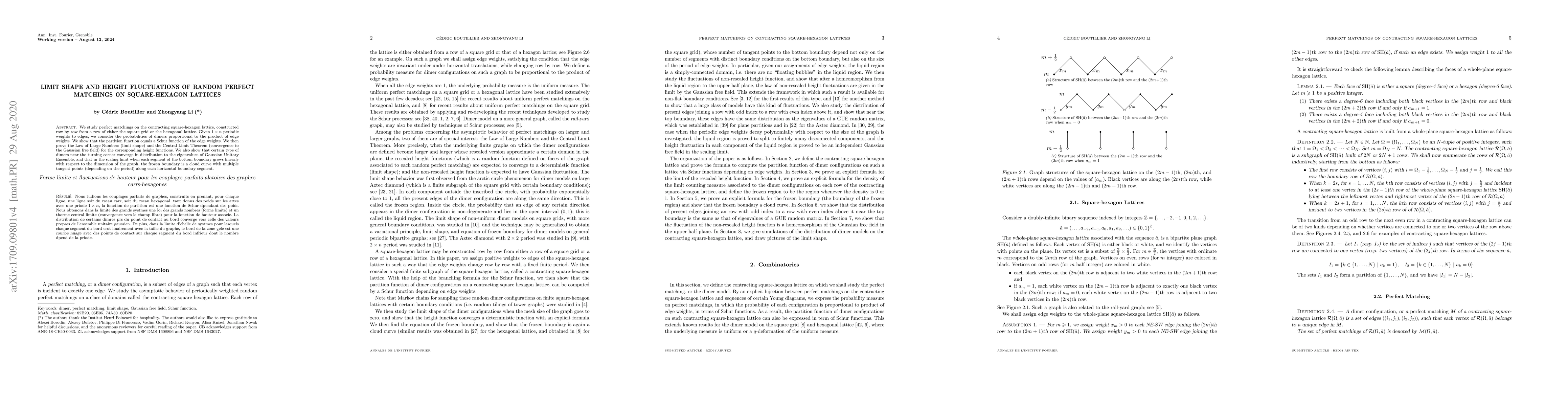 We study asymptotics of perfect matchings on a large class of graphs called the contracting square-hexagon lattice, which is constructed row by row from either a row of a square grid or a row of a hexagonal lattice. We assign the graph periodic edge weights with period $1\times n$, and consider the probability measure of perfect matchings in which the probability of each configuration is proportional to the product of edge weights. We show that the partition function of perfect matchings on such a graph can be computed explicitly by a Schur function depending on the edge weights. By analyzing the asymptotics of the Schur function, we then prove the Law of Large Numbers (limit shape) and the Central Limit Theorem (convergence to the Gaussian free field) for the corresponding height functions. We also show that the distribution of certain type of dimers near the turning corner is the same as the eigenvalues of Gaussian Unitary Ensemble, and that in the scaling limit under the boundary condition that each segment of the bottom boundary grows linearly with respect the dimension of the graph, the frozen boundary is a cloud curve whose number of tangent points to the bottom boundary of the domain depends on the size of the period, as well as the number of segments along the bottom boundary.
