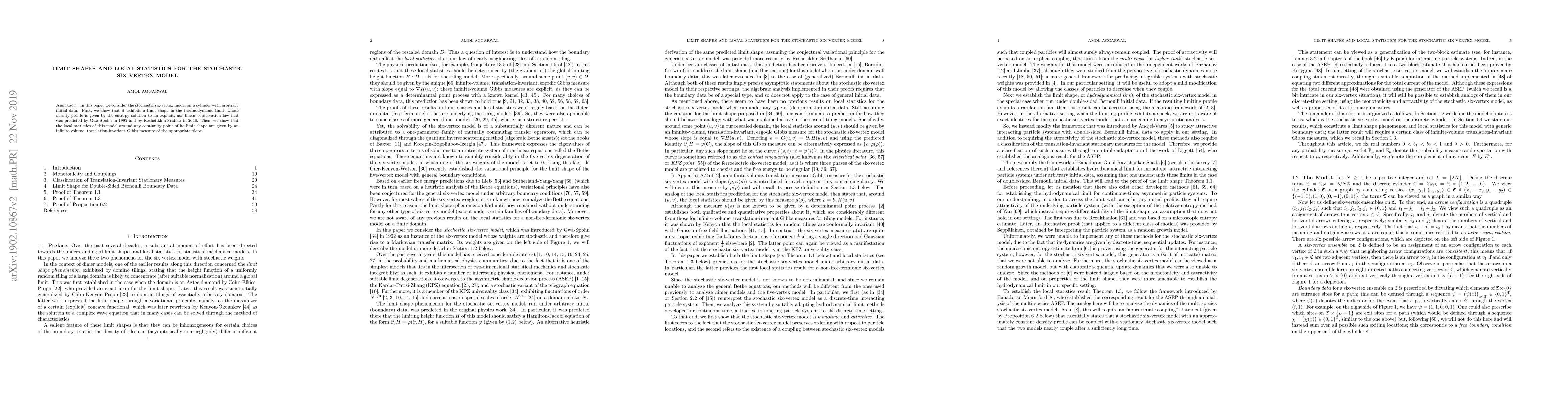 This paper investigates the stochastic six-vertex model on a cylinder, demonstrating its limit shape in the thermodynamic limit, which matches the entropy solution to a non-linear conservation law. It also reveals that local statistics around the limit shape follow an infinite-volume Gibbs measure.