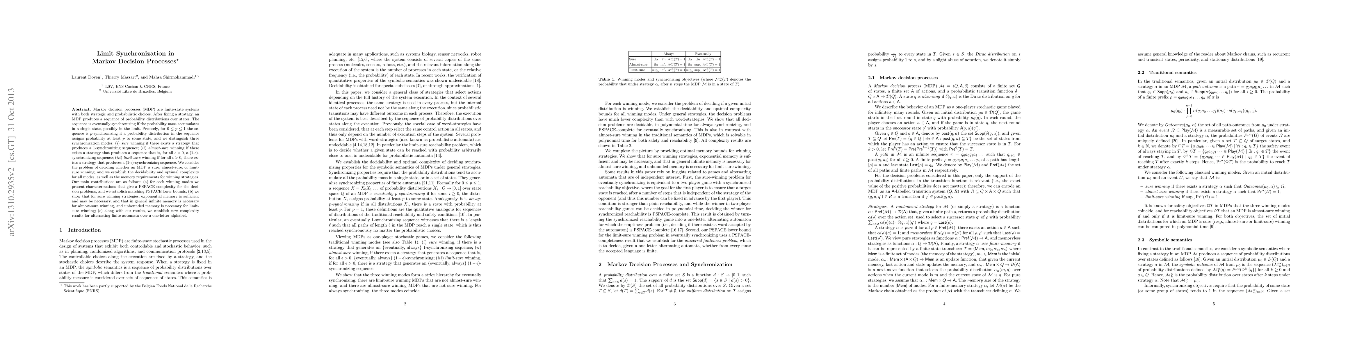 This paper explores synchronization in Markov decision processes (MDPs), distinguishing between sure, almost-sure, and limit-sure winning strategies. It establishes decidability and optimal complexity for these modes, showing PSPACE complexity and memory requirements, including exponential, infinite, and unbounded memory for different winning strategies.