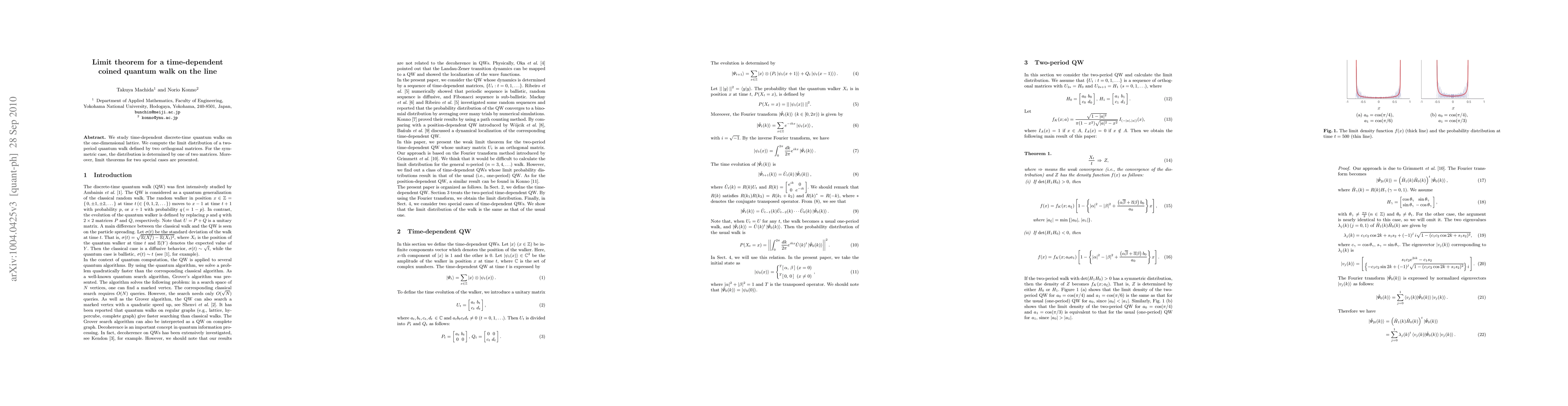 This paper investigates time-dependent quantum walks on a one-dimensional lattice, focusing on the limit distribution of a two-period quantum walk defined by orthogonal matrices. The symmetric case's distribution is determined by one of the two matrices, and special cases are also analyzed.