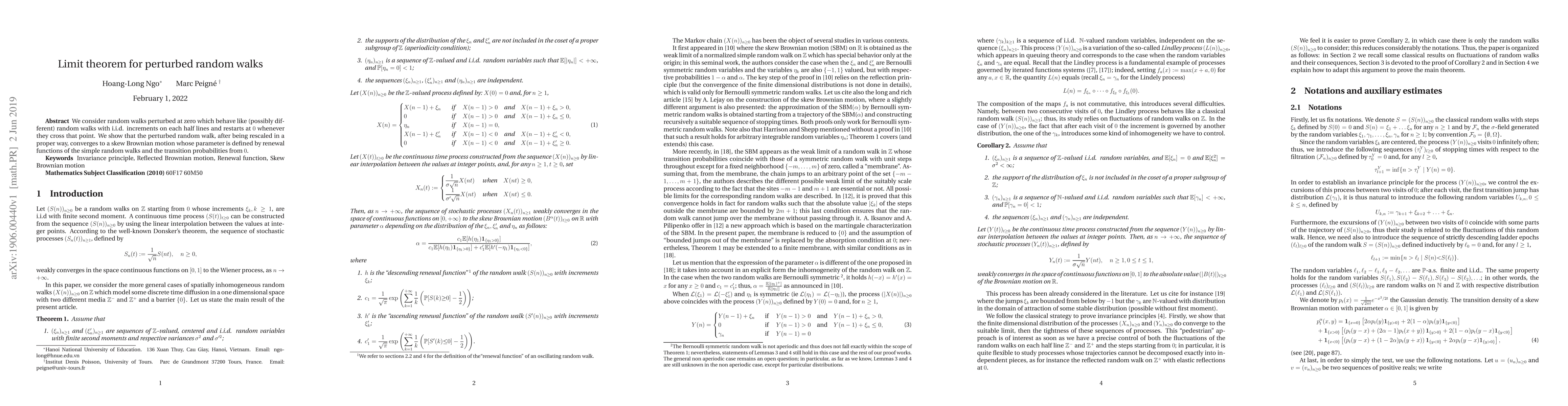 The paper investigates perturbed random walks that restart at zero, showing that after appropriate rescaling, they converge to a skew Brownian motion. The convergence parameter is determined by the renewal functions of the simple random walks and transition probabilities from zero.