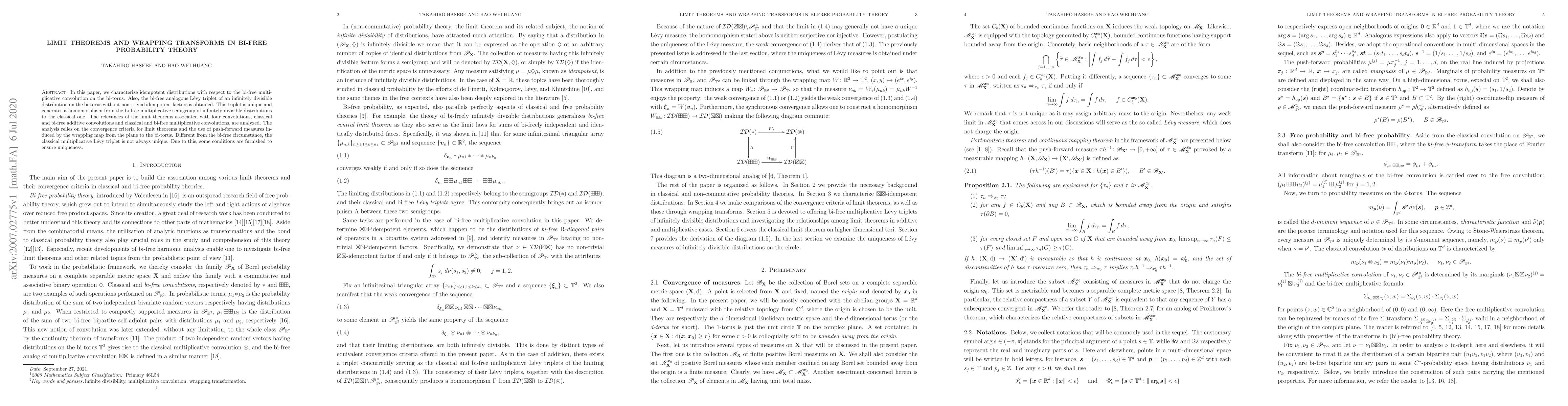 This paper investigates idempotent distributions and bi-free multiplicative convolutions on the bi-torus, introducing a unique bi-free Lévy triplet for infinitely divisible distributions. It also examines limit theorems associated with various convolutions, utilizing the wrapping map and convergence criteria to analyze their relevance.