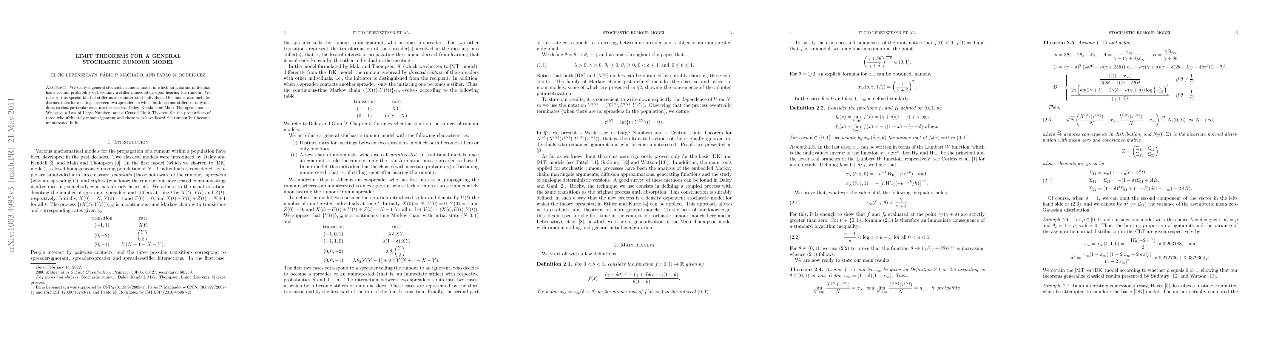 This paper proves key limit theorems for a general stochastic rumor model, showing how ignorance and interest in rumors behave as the number of individuals increases. It provides insight into how information spreads and is received in social networks.