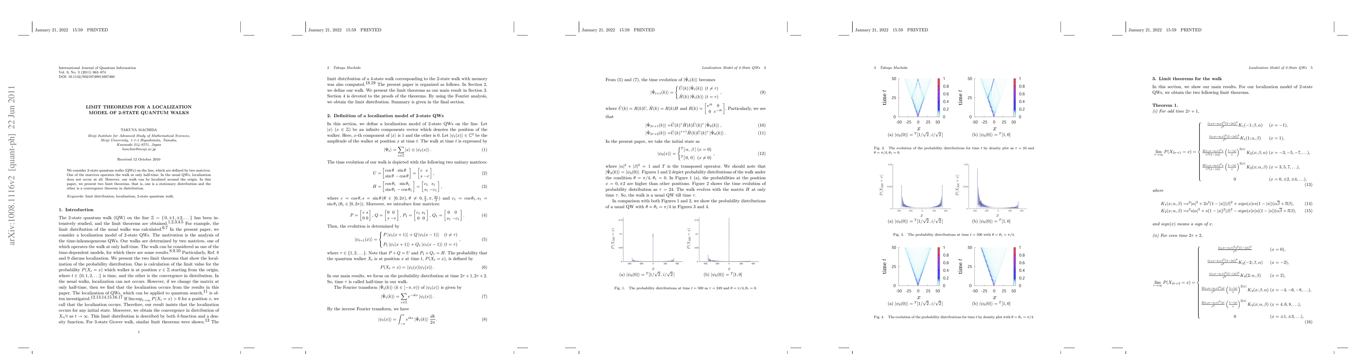 We consider 2-state quantum walks (QWs) on the line, which are defined by two matrices. One of the matrices operates the walk at only half-time. In the usual QWs, localization does not occur at all. However, our walk can be localized around the origin. In this paper, we present two limit theorems, that is, one is a stationary distribution and the other is a convergence theorem in distribution.