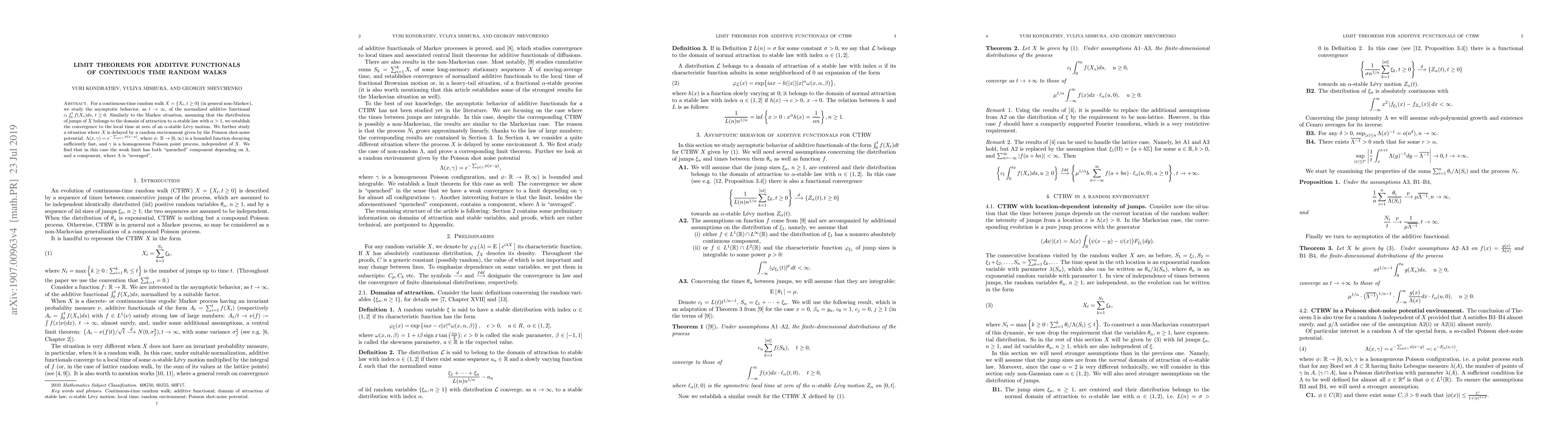 This research paper studies the asymptotic behavior of a normalized additive functional of continuous-time random walks, establishing convergence to local time at zero under certain conditions, and also investigates its behavior in the presence of Poisson shot-noise potential.