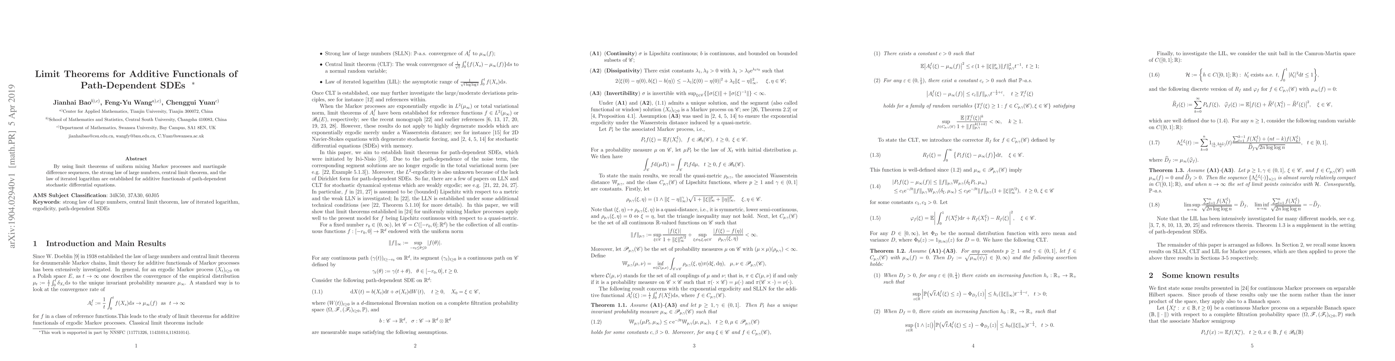 By using limit theorems of uniform mixing Markov processes and martingale difference sequences, the strong law of large numbers, central limit theorem, and the law of iterated logarithm are established for additive functionals of path-dependent stochastic differential equations.