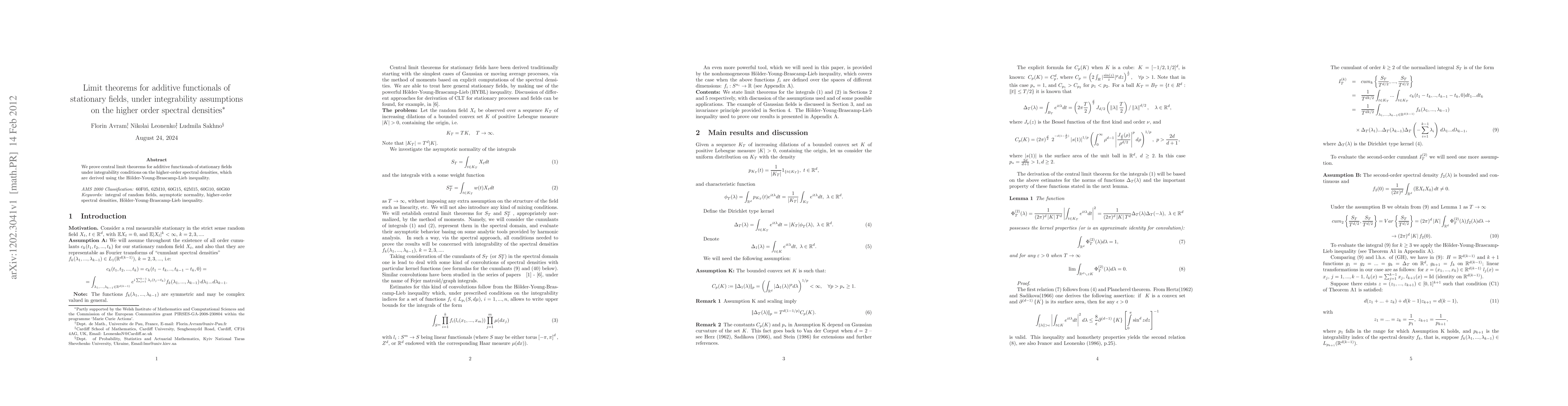 Researchers prove central limit theorems for additive functionals of stationary fields under certain integrability conditions on spectral densities.
