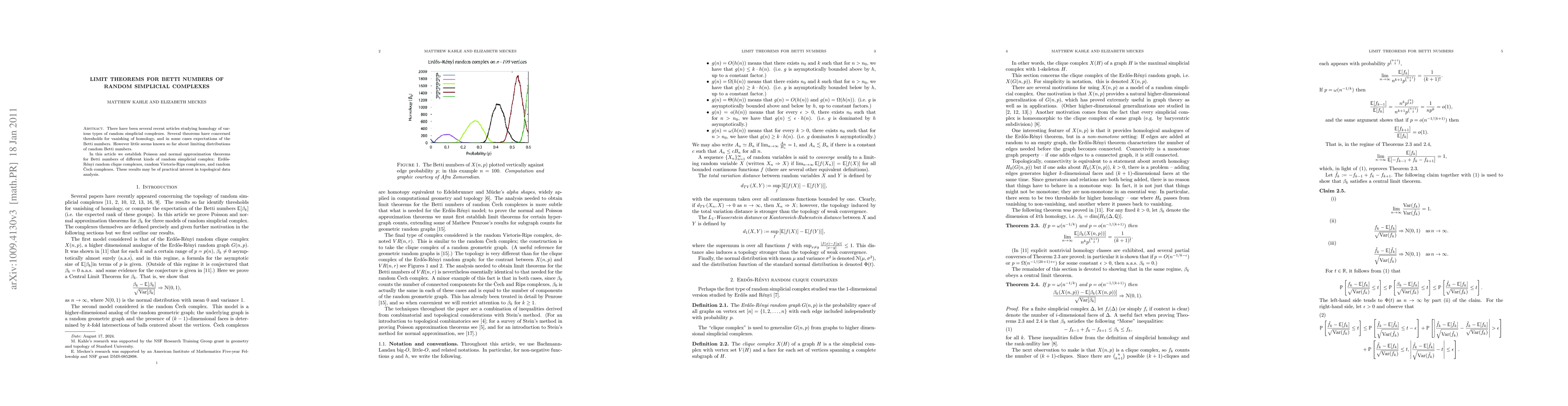 This paper establishes Poisson and normal approximation theorems for Betti numbers of three types of random simplicial complexes: Erdős-Rényi random clique complexes, random Vietoris-Rips complexes, and random Čech complexes. These results provide insights into the limiting distributions of Betti numbers, which could be useful in topological data analysis.