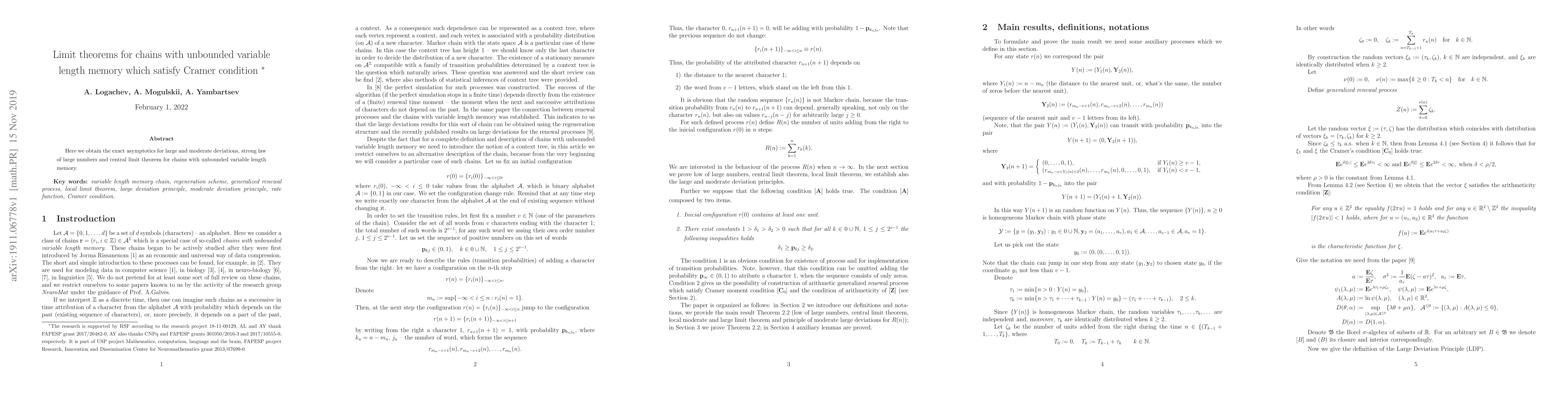 Summary: This paper establishes limit theorems, including large and moderate deviations, strong law of large numbers, and central limit theorems, for chains with unbounded variable length memory that satisfy the Cramer condition. The exact asymptotic behavior of these chains is analyzed.