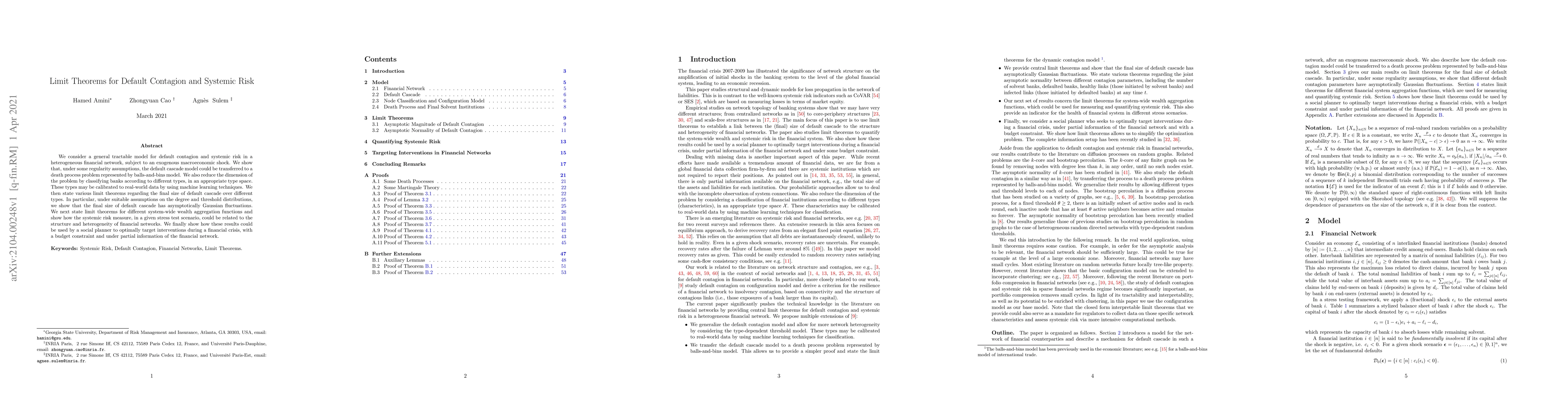 We consider a general tractable model for default contagion and systemic risk in a heterogeneous financial network, subject to an exogenous macroeconomic shock. We show that, under some regularity assumptions, the default cascade model could be transferred to a death process problem represented by balls-and-bins model. We also reduce the dimension of the problem by classifying banks according to different types, in an appropriate type space. These types may be calibrated to real-world data by using machine learning techniques. We then state various limit theorems regarding the final size of default cascade over different types. In particular, under suitable assumptions on the degree and threshold distributions, we show that the final size of default cascade has asymptotically Gaussian fluctuations. We next state limit theorems for different system-wide wealth aggregation functions and show how the systemic risk measure, in a given stress test scenario, could be related to the structure and heterogeneity of financial networks. We finally show how these results could be used by a social planner to optimally target interventions during a financial crisis, with a budget constraint and under partial information of the financial network.