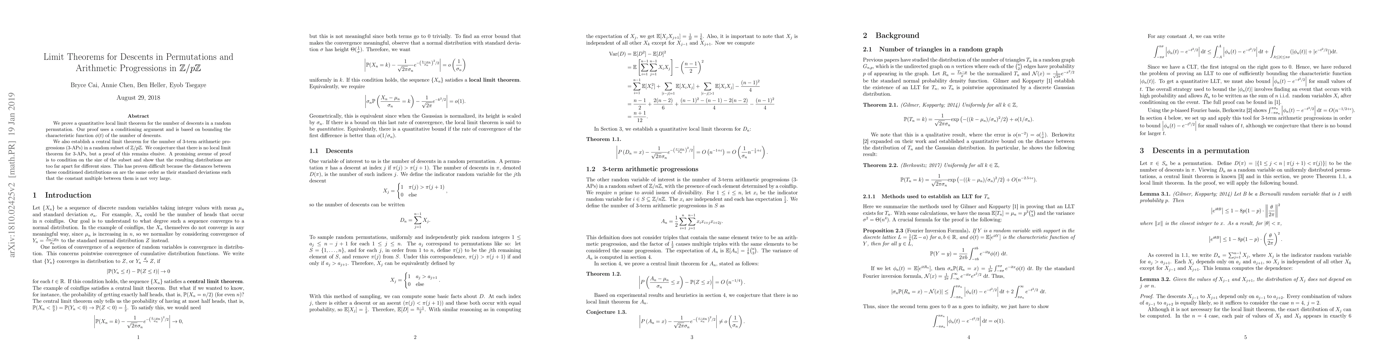 This paper proves a local limit theorem for descents in random permutations and a central limit theorem for 3-term arithmetic progressions in a random subset of $\mathbb{Z}/p\mathbb{Z}$. The authors conjecture that no local limit theorem exists for 3-APs, suggesting a challenging proof approach.