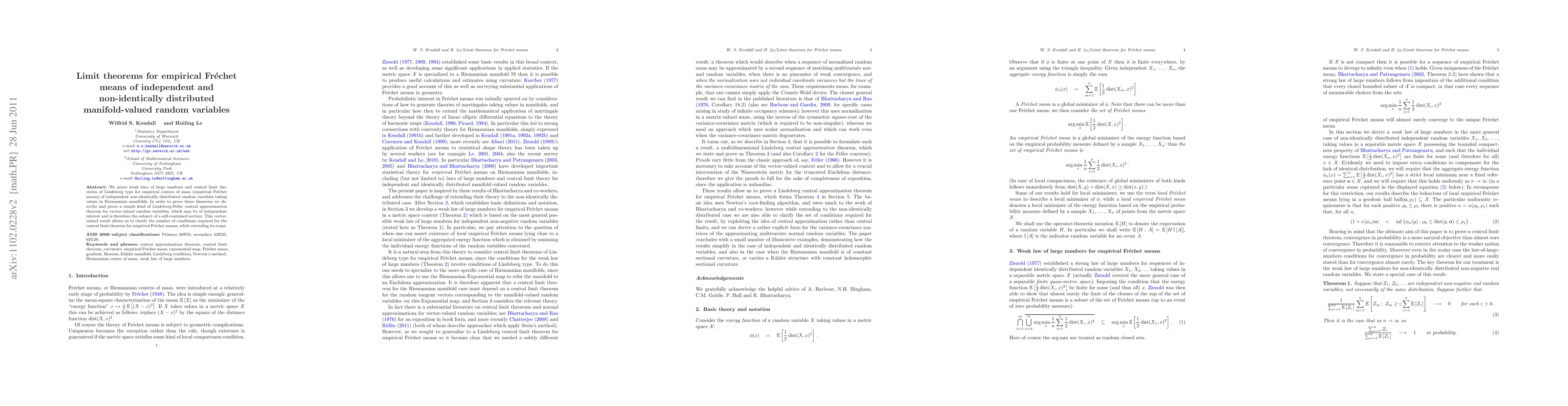 We prove weak laws of large numbers and central limit theorems of Lindeberg type for empirical centres of mass (empirical Fr\'echet means) of independent non-identically distributed random variables taking values in Riemannian manifolds. In order to prove these theorems we describe and prove a simple kind of Lindeberg-Feller central approximation theorem for vector-valued random variables, which may be of independent interest and is therefore the subject of a self-contained section. This vector-valued result allows us to clarify the number of conditions required for the central limit theorem for empirical Fr\'echet means, while extending its scope.