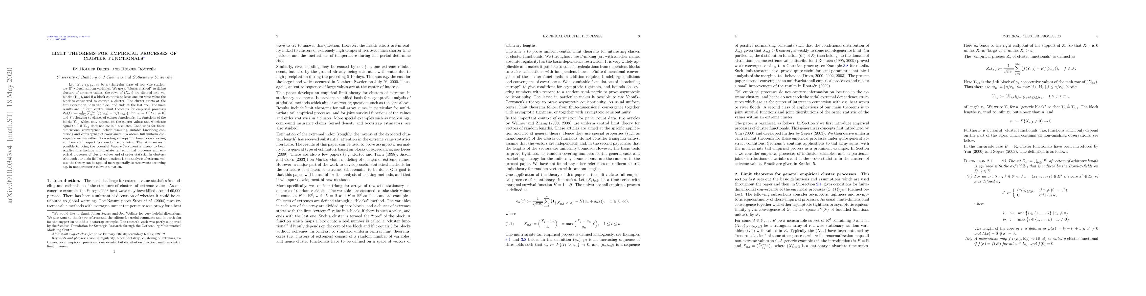 This paper establishes uniform central limit theorems for empirical processes of cluster functionals derived from a triangular array of $\mathbb{R}^d$-valued random variables. It uses a "blocks method" to identify clusters of extreme values and applies this to derive conditions for finite-dimensional convergence and full uniform convergence. Applications extend to multivariate tail empirical processes and rare events in nonparametric curve estimation.