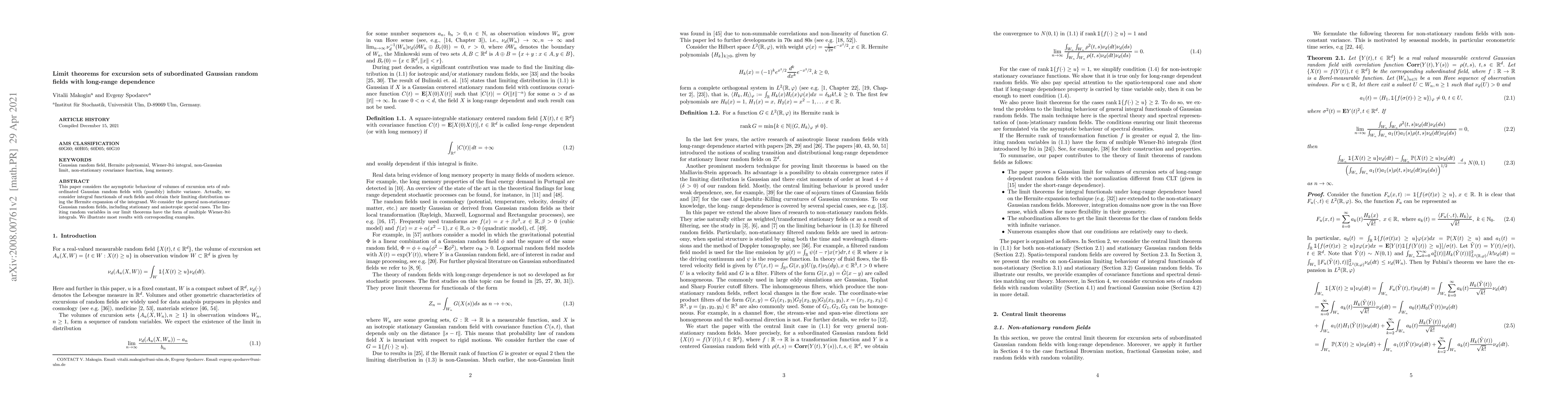 This paper considers the asymptotic behaviour of volumes of excursion sets of subordinated Gaussian random fields with (possibly) infinite variance. Actually, we consider integral functionals of such fields and obtain their limiting distribution using the Hermite expansion of the integrand. We consider the general non-stationary Gaussian random fields, including stationary and anisotropic special cases. The limiting random variables in our limit theorems have the form of multiple Wiener-It\^{o} integrals. We illustrate most results with corresponding examples.