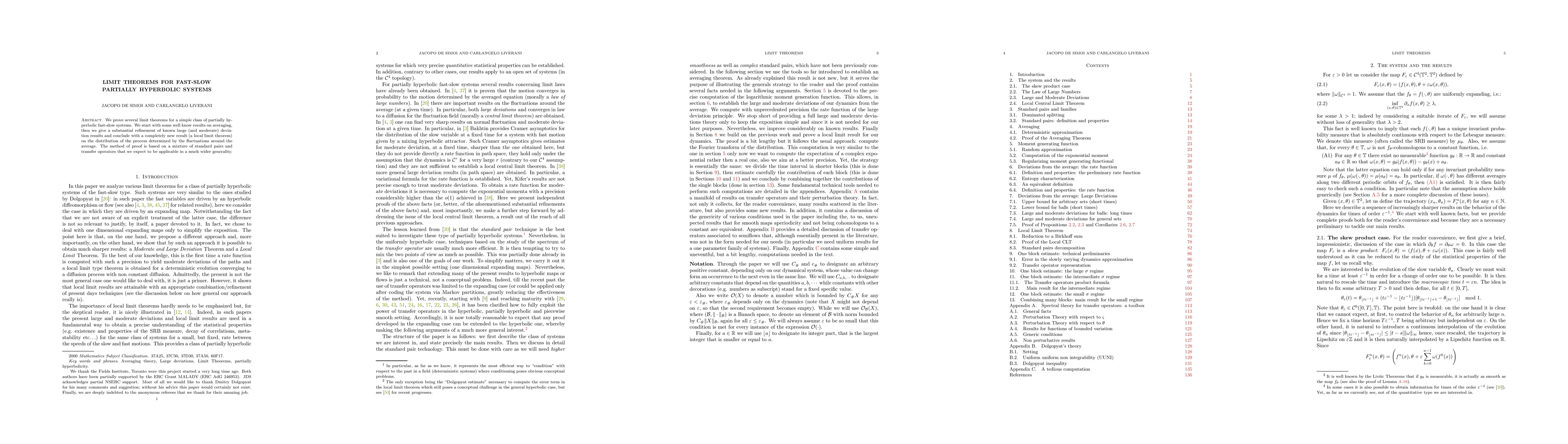 This paper proves limit theorems for fast-slow partially hyperbolic systems, refining large deviation results and introducing a new local limit theorem. The proof utilizes a combination of standard pairs and Transfer Operators, suggesting broader applicability.